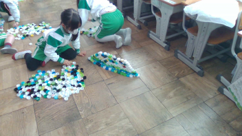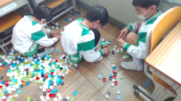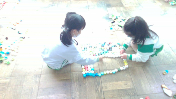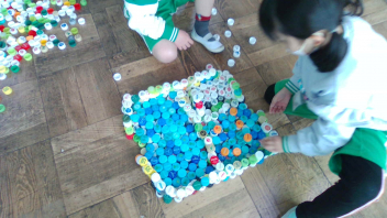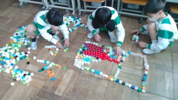 子供たちは、そのキャップを並べて見たり積み上げたりしながら、いろいろな形を表現していました。