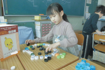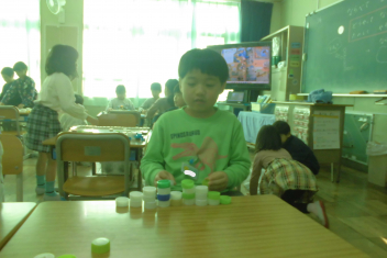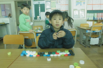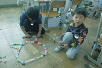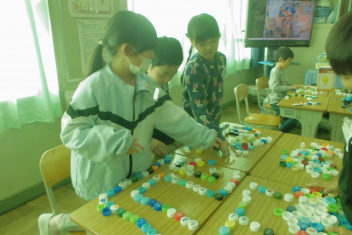 •  1年生の図画工作科「ならべて ならべて」の学習では、ペットボトルキャップを使い、想像力を働かせながらいろいろな模様や立体作品を作っていました。