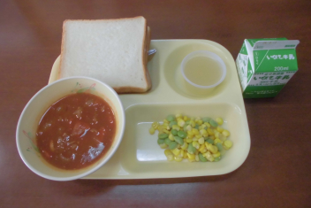 • パン、牛  乳、トマトシチュー、コーンと枝豆 のソテー、りんごゼリー