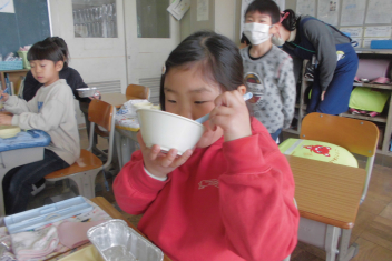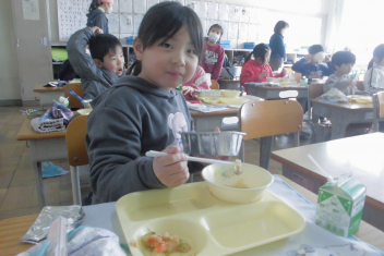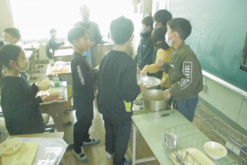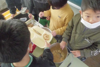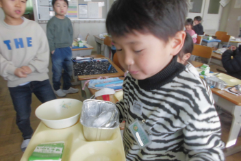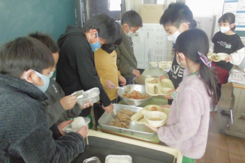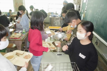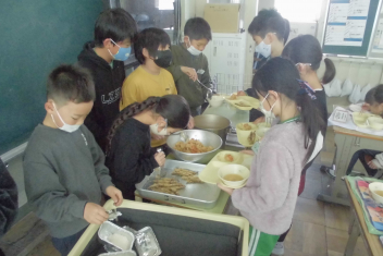 •  給食当番が給食を配った後、自分が食べられる量を調整しています。