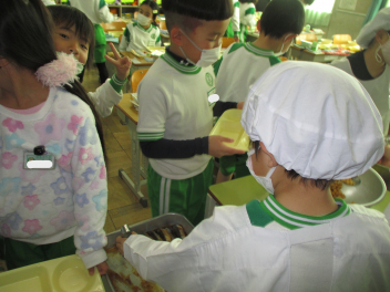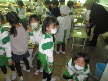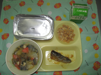 • ごはん、牛  乳、いわしの梅煮、実 だくさん汁、福豆