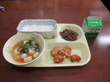 • ごはん、牛  乳、鶏肉 の香味揚 げ、かみなりこんにゃく、五目汁