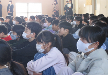 練習の最後には、担任の先生から卒業する6年生への思いが伝えられました。子供たちは真剣な表情で話を聴いていました。