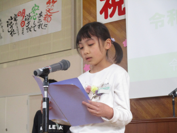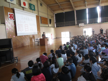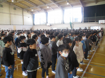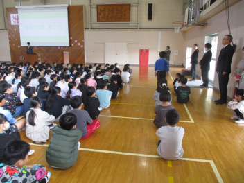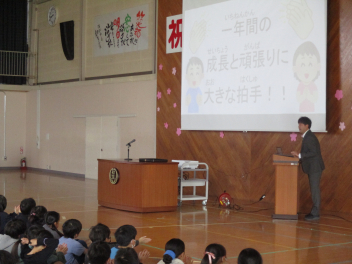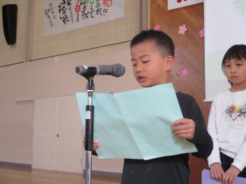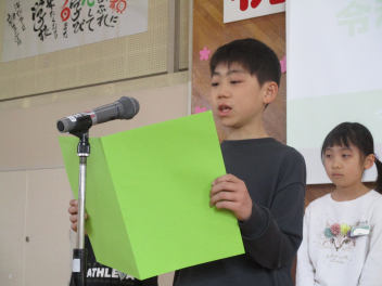 次に、1・3・5年の代表の子供たちが、本年度頑張ったことや来年度頑張りたいことを立派に発表しました。周りの子供たちの聴く態度も大変すばらしく、発表の後には体育館中に大きな拍手が響き渡りました。