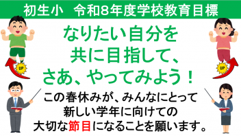 この6年間、初生小学校で学んだ多くのことを土台に、いつまでも、そして、どんなときも『なりたい自分を共に目指して、さあ、やってみよう!』を大切に生きていくことを通して、自分らしさをより一層輝かせながら、幸せな人生を歩んでください。