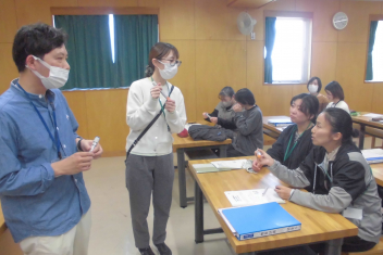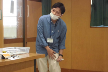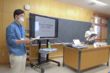 研修会では、アレルギーに関する知識や初生小学校のアレルギー対応について確認したり、エピペントレーナー(エピペンの使用方法を安全に練習するための模擬器具)を使って実際に実演したりしました。
