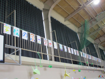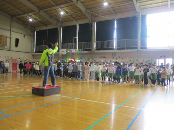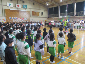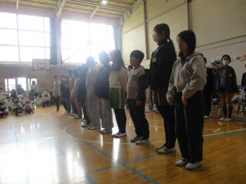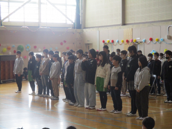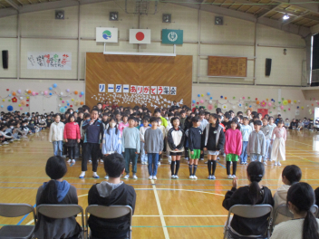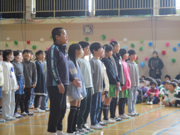 オープニングでは、5年生の代表の子がリードしながら、全校でスローガン「学校のリーダーへ ありがとう 中学校へ明るく元気に送り出そう!」を発表しました。
