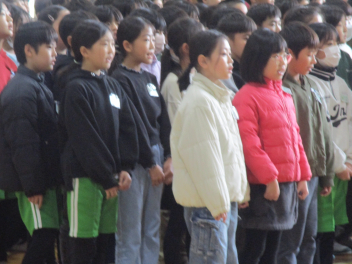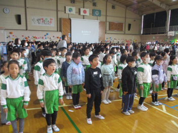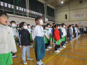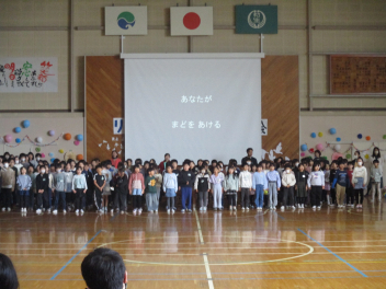 また、6年生の呼び掛けで、全校で校歌を歌いました。これが、6年生と一緒に歌う最後の校歌でした。