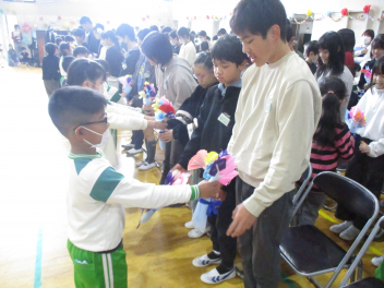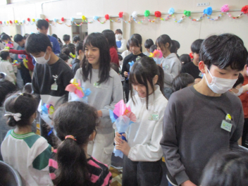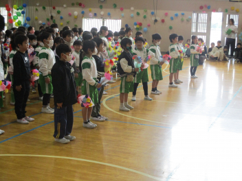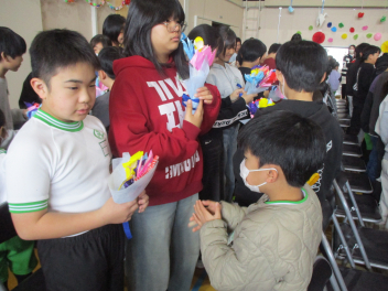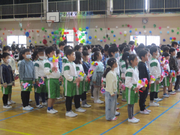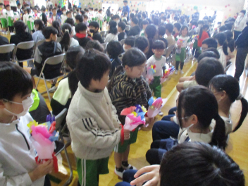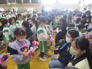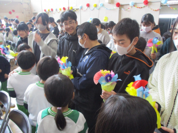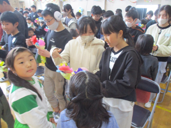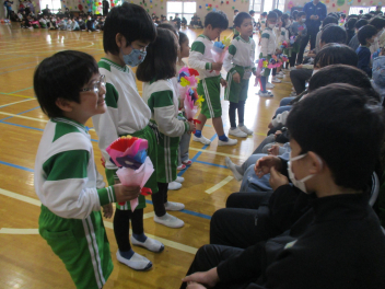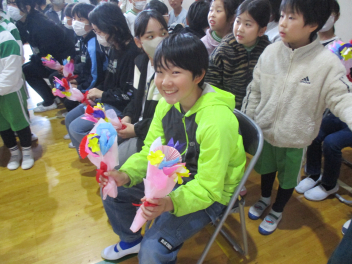 1年生は、下級生みんなで気持ちを込めて作った花束を、代表で6年生にプレゼントしました。