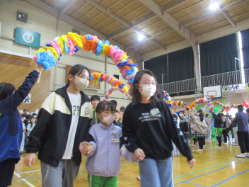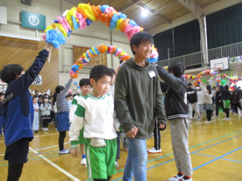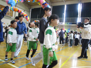 下級生の温かな拍手が体育館中に響く中、6年生と1年生が一緒に入場しました。laugh