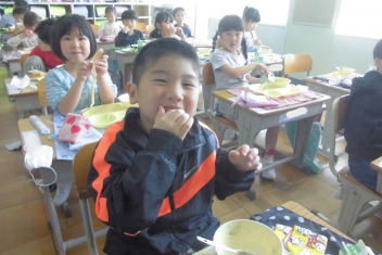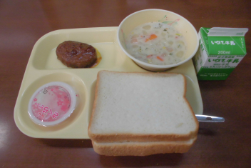 •  今日の給食は、麦入りご飯、たけのこご飯、牛乳、厚焼き玉子、のっぺい汁frownでした。今日の給食も、友達とおいしくいただきました。