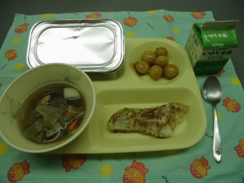 • ごはん、牛乳、たらのすだちじょうゆかけ、いものこ汁、月見団子