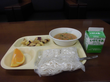 • ソフトめん、牛乳、肉みそソース、さつまいものごま揚げ、オレンジ