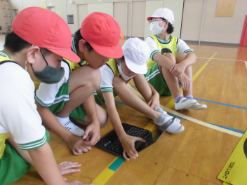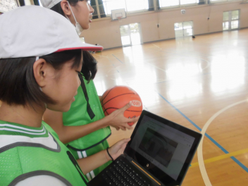 また、タブレット型端末を利用してゲームの様子を撮影していました。単元の途中に、自己分析タイムを設け、撮影した動画を見ながら自分たちのチームの特長(強みと弱み)を分析していく計画になっています。