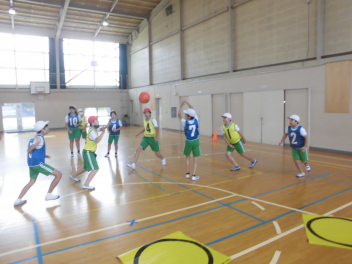 シートバスケットボールとは、ゴールの近くに2枚のシート(円)を置き、そのシートの中ではディフェンスすることができません。ボールの扱いに慣れていない子も、このシート内に入れば自分のタイミングでシュートを打つことができます。
