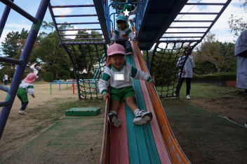 秋晴れの空の下、こどもたちは園庭で元気に遊んでいます。