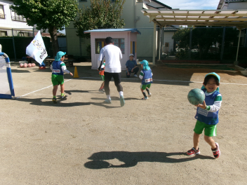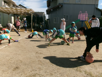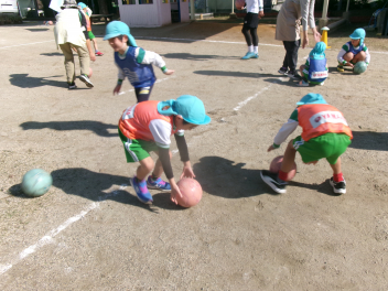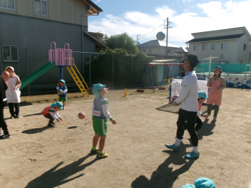 ボールを転がしたり、ボールをキャッチしたりして友達になります