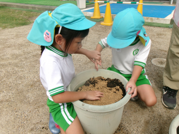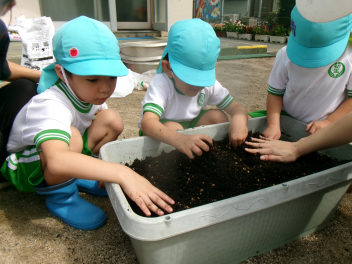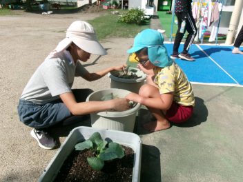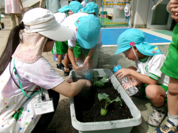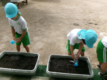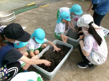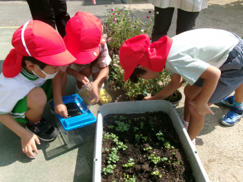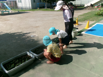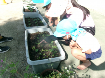 大根の種を植えたプランターから芽が出ていることに気付いたそら組のこどもたち