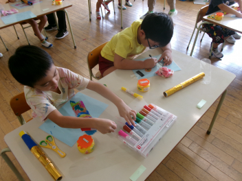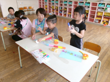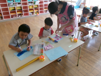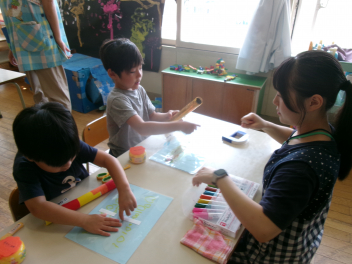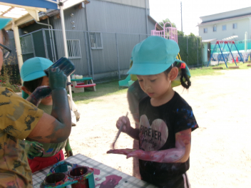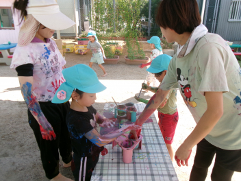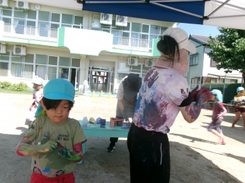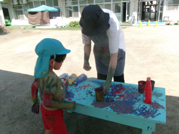 先生たちも一緒になって絵の具の感触や色の混ざりを楽しんでいました。