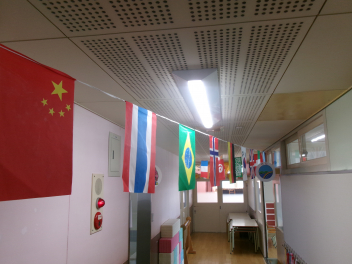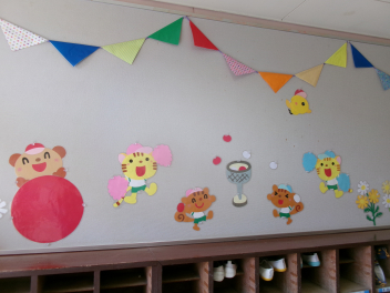 朝、幼稚園に来ると廊下に万国旗が飾られていました
