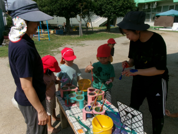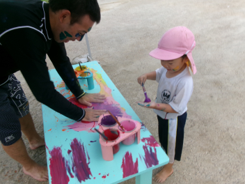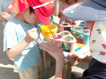 今日は園庭に、絵の具で遊ぶ環境が準備されていました。
