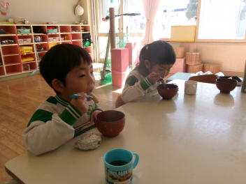 心の鬼を追い出したことを喜び、福菓子を一緒に食べます。