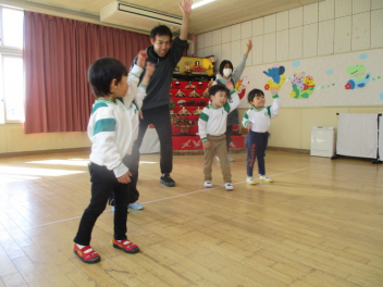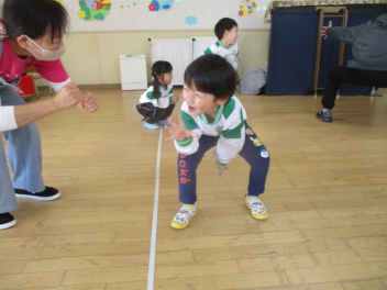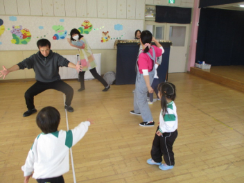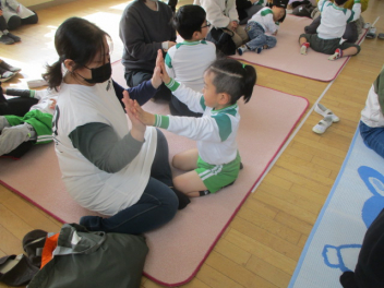 お母さん、お父さんと一緒に体を動かしたりして遊びます。
