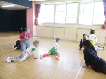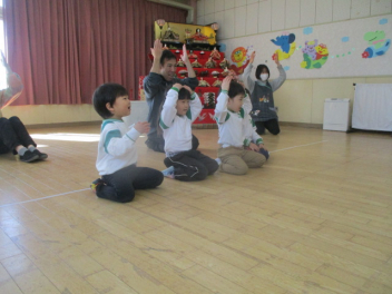 最初は「だるまさん」に変身して体操だ