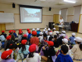 グループごとにお弁当を食べた後は、動物愛護センターで獣医さんによる動物の赤ちゃんについてのお話を聞きました。写真や動画で分かりやすく説明して頂き、子供たちも興味を持って話を聞くことができました。予定をしていた質問の時間を過ぎても、たくさん手があがり、子供たちの意欲の高さに感心しました。