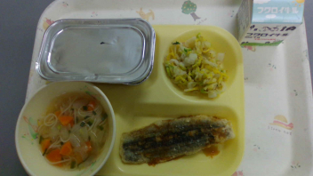 今日の給食は「ごはん、牛乳、さんまの蒲焼き、にゅうめん、白菜の即席づけ」でした