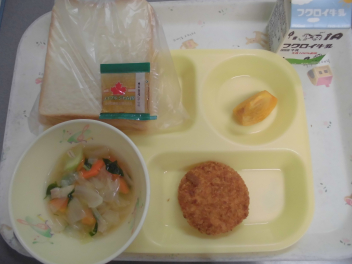 今日の給食は「パン、牛乳、メープルジャム、さつまいもコロッケ、大麦のスープ、柿」でした