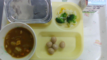 今日の給食は「ごはん、牛乳、鶏肉ときのこのカレー、しょうゆ卵、キャベツとブロッコリーのサラダ」でした