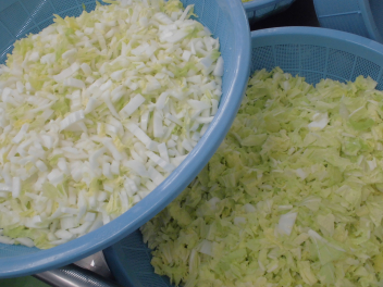 白菜づけの白菜は、葉と芯の硬さが違うので、まず部分ごとに分けて洗い、切るときは芯は少し小さめに、葉は少し大きめにして食べやすい大きさにしています
