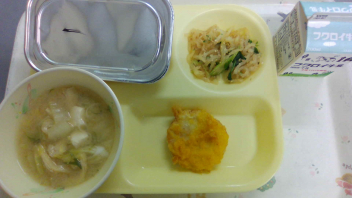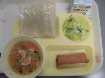 今日の給食は「中華めん、牛乳、五目ラーメン、春巻、白菜づけ」でした