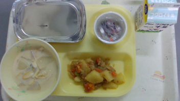 今日の給食は「ごはん、牛乳、そぼろ肉じゃが、豆乳汁、糸引納豆」でした
