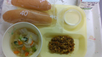 今日の給食は「パン、牛乳、ドライカレー、ベーコンと白菜のスープ、プリン」でした