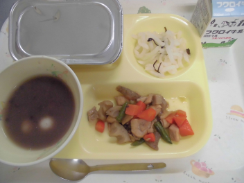 今日の給食は「ごはん、牛乳、いりどり、だいこんの浅づけ、おしるこ」でした