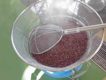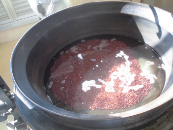 おしるこに使用した小豆は2回茹でこぼして丁寧にアクを取り、優しい甘さになるようにじっくり煮ました