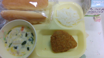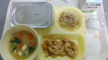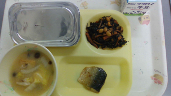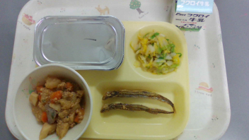今日の給食は「ごはん、牛乳、ポークカレー、野菜の塩もみ、フルーツミックス」でした