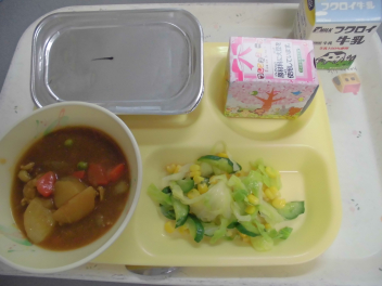 今日の給食は「ごはん、牛乳、青菜のごまふりかけ、じゃがいもと大豆のそぼろあえ、みそ汁、みかんゼリー」でした
