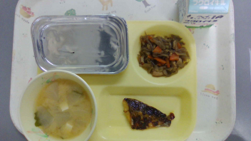 今日の給食は「ごはん、牛乳、さばの塩こうじ焼き、鶏ごぼう、みそ汁」でした