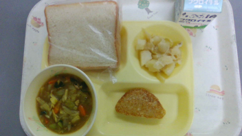 今日の給食は「パン、牛乳、ボロニアソーセージフライ、リヨネーズポテト、カレースープ」でした