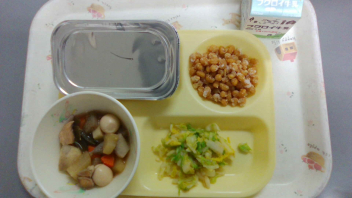今日の給食は「ごはん、牛乳、関東煮、大豆のから揚げ、白菜の即席づけ」でした
