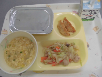 今日の給食は「ごはん、牛乳、鶏肉と野菜の中華炒め、揚げぎょうざ、スーミータン」でした