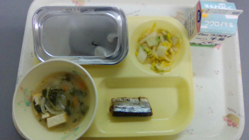 今日の給食は「ごはん、牛乳、さんまのかぼす煮、厚揚げのみそ汁、白菜づけ」でしたsad