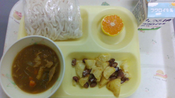 今日の給食は「うどん、牛乳、カレーうどん、二色揚げ、みかん」でした