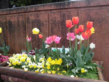 東門の植え込みのチューリップにかわいい「つぼみ」が出てきました。