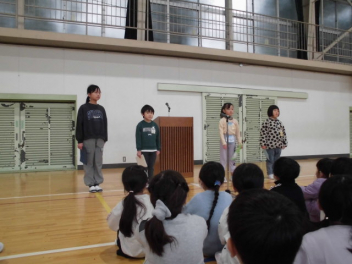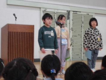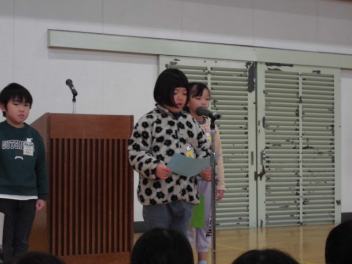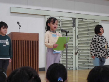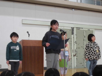 教頭先生の「開式の言葉」の後、まず児童の代表者4名が、「3学期に頑張りたいこと」を発表しました。