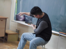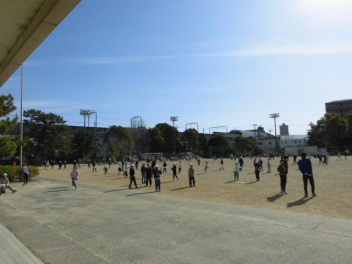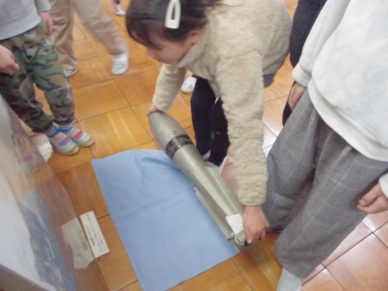 初めに、講師の方から、「戦争とは何か」や「戦時中の人々の暮らし」、「曳馬の街の被害」などについて教えていただきました。その後、博物館から持って来ていただいた貴重な資料や実物を見せていただきました。子供たちは、実物の「寄せ書き日の丸」や爆弾の模型に興味津々でした