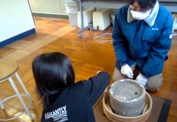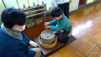 「昔のくらしの道具体験」では、江戸時代のアイロン「ひのし」や石臼の体験しました。3年生は、炭火を使用したアイロンに興味津々でした。炭火アイロン2種類と電気スチームアイロンを体験しましたが、「電気スチームアイロンが一番しわが伸びた